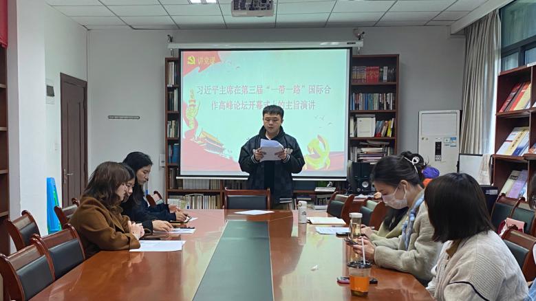 包宏萍同志领学习近平主席在庆祝中华人民共和国成立74周年招待会上的讲话,刘舸同志领学习近平主席在第三届“一带一路”国际合作高峰论坛开幕式上的主旨演讲。随后,与会党员分享心得陈昌强同志表示通过坚持理论创新的魂和根、及时科学解答时代新课题、着力推进党的理论创新体系化学理化、注重从人民群众的创造中汲取理论创新智慧四个方面,不断开辟马克思主义中国化时代化新境界朱泓锦同志指出作为一名马院学子,努力将理论与实践相结合,深刻理解人与自然和谐共生的现代化