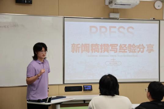 活动伊始,段佑蓉学姐精炼提出一篇优秀的新闻稿需具备实际性、体现理论性、凸显实践性:做到一切从实际出发,理论联系实际,在实践中检验和发展真理。接着,她围绕新闻稿撰写的共性概述、分类要求及格式规范详细开展经验分享。其一是增强主题意识,使主题始终贯穿新闻撰写全过程;其二是精炼语言表达,熟悉不同稿件类型的语言风格,做到灵活切换;其三是完善细节处理,认真检查文稿前后人物称呼是否一致,有无错别字等问题。活动最后,她鼓励在场同学“多看多练多改”,在实践中不断提升稿件撰写水平。