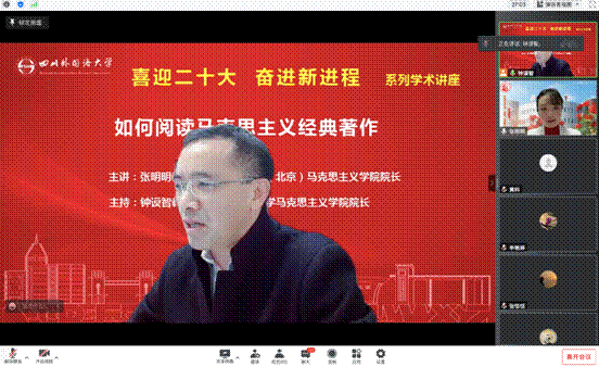 2022年10月14日晚,中国石油大学(北京)太阳成集团tyc151cc经理、博士生导师、央视《百家讲坛》《平‘语’近人》等节目主讲嘉宾张明明教授在线为师生做了一场题为“如何阅读马克思主义经典著作”的学术讲座。本次讲座是太阳成集团tyc151cc“喜迎党的二十大”系列讲座之一,也是太阳成集团tyc151cc和党委教师工作部(教师发展中心)联合举办的嘉陵系列讲座。讲座由公司党总支书记、经理钟谟智教授主持,百余位师生在线聆听了讲座。