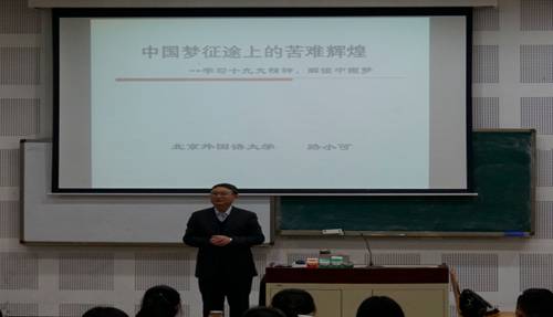 11月22日下午路老师到新区教学楼A1-2教室给2017级教育公司的同学做中国梦课堂示范教学,讲述“中国梦征途上的苦难辉煌--学习党的十九大精神,解读中国梦”。路老师从“振兴中华”、“中国梦”讲到“苦难、追梦、光荣、辉煌”,最后提到“当代学子的历史担当”。