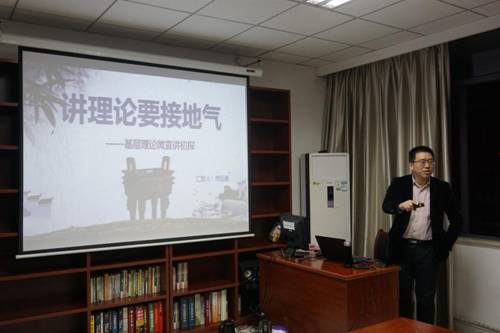 周廷勇教授认为,要使深奥晦涩的理论知识变成为生动鲜活的道理,首先是必须明白“如何讲”的问题。他认为一场生动的理论课需要三要素:思想上须有独立创见,逻辑上需要严谨论证,语言上富于优美表达,唯有这样才能将灰色的理论变成为栩栩如生的日常道理,让同学们的思想在笑声中得到升华。其次是“讲什么”的问题。他认为思政理论课教师在近期和未来相当长的时期,要紧紧围绕党的十九大报告主题、十九大的成果和历史性贡献等方面来展开课堂教学,教师应当在学懂理论的基础上,弄通这些理论,并能够落实,指导实践。最后是“讲的如何”的问题。他指出,一场接地气的理论课应当使听者在亲近的语言中、贴近的事例中感到时光飞逝、意犹未尽和获益匪浅。思政理论课教师讲理论要接地气就是要坚持因事而化、因时而进、因势而新,要勇于创新授课形式,并久久为功、不断实践,最终能够让员工在幽默诙谐的语言表述中“不仅能震撼一瞬间、激动一阵子,而且能铭记一辈子、影响一辈子”,让理论从空中回到地上、从天边走近身边,从文本融入文化、从自在转化为自为。