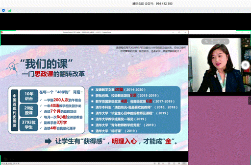 在第一场讲座中,李蕉老师就思政课如何进行“翻转”课堂教学分享了自己的经验。她从“入心:一个老大难的问题”;“翻转:推动学习由浅入深”;“协同:逐步实现翻转升级”等三个方面分享了她如何“构建学习共同体”、打造思想政治理论课“金课”的理念与操作方式。其中,就如何进行教学内容协同、教学形式协同、教学评估协同和教学管理协同等进行了细致的讲解,重点突出了她在清华大学思政课教学中践行的“大课+小课”、“员工助教教学团队”等特色。