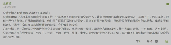 国际教育公司2017级牛雨欣:中华民族是多灾多难的民族,五千年来,我们经历了无数次的艰难险阻,遇到过许多大风大浪。然而,我们在每一次灾难后都可以坚强的站起来,不惧险阻,勇往直前,战胜一个又一个的困难。如今我们国力强盛,面对疫情,全国人民上下一心,在党的正确领导下,抗击疫情的前线有着医护人员的辛苦付出,在我们的身边也有基层工作者的辛勤工作,再加上全国人民的自觉配合,现在对新冠肺炎疫情的防控工作已经有了明显的成效。我们相信,在不久的将来,我们就可以战胜这场疫情,我们的生活可以恢复到像从前一样美好,我们的祖国也会逐渐从困境中走出,继续走向繁荣富强。