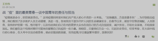 2019级硕士生朱俊光:抗“疫”彰显了中国特色社会主义的制度优势:第一,彰显了党的集中统一领导制度的显著优势。第二,彰显了人民当家作主的政治制度的显著优势。第三,彰显了社会主义基本经济制度的显著优势。第三,彰显了繁荣发展社会主义先进文化的显著优势。