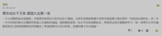 英语公司2019级岳姝彤:此次思政大课中最让我印象深刻的来自中央财经大学的冯秀军老师的授课。她所谈及的中国青年的责任与担当,国家兴亡匹夫有责的责任传承,“苟利国家生死以之”的爱国精神接续,正是中华民族生生不息,亘古绵延的精神密码。我们在这场战“疫”大考中认识中国:她有一个以人民为中心、与人民血肉相连的执政党,为人民谋幸福,为民族谋复兴是她的初心和使命;她有具有伟大团结精神的人民,每个人守望相助同舟共济;她有博大的人类命运共同体情怀,我们“生于种花家,何其荣幸”!她有那些心有大我,肩有大任,行有大德的冲锋陷阵奉献自我的榜样们,有勇于担当的青年。我相信,中华民族的力量会更加强大,我们的战“疫”终将胜利。春暖花开时,我们迎接英雄归来!