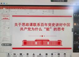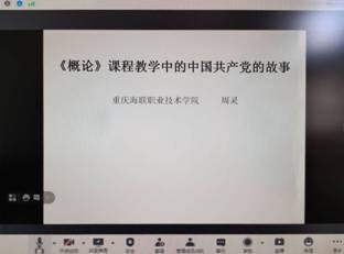 第四位发言的是重庆海联职业技术公司思想政治理论课教研部的周灵老师,她发言的题目是:《概论》课程教学中的中国共产党的故事。周灵老师从“讲好中国共产党带领人民从站起来、富起来到强起来的雄辩事实;讲好中国共产党勇于牺牲、善于斗争、敢于胜利的崇高品格;讲好中国共产党为人民谋幸福、为民族谋复兴、为世界谋大同的高远情怀;讲好中国共产党为什么“能”、靠什么成功的硬核道理”四个方面,分享了对《毛泽东思想和中国特色社会主义理论体系概论》课程教学中如何联系百年党史讲好中国共产党为什么“能”的认识和体会。