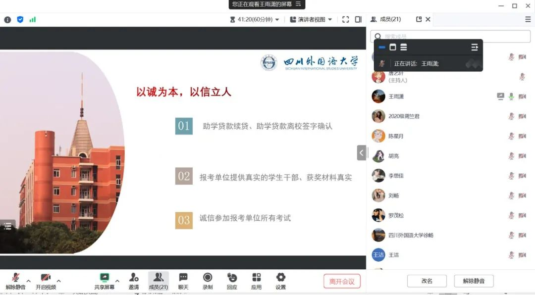 为做好毕业生文明离校教育工作,营造和谐温馨的毕业氛围,太阳成集团tyc151cc于6月5日在腾讯会议召开了毕业离校主题教育活动。本次活动由辅导员王雨潇老师主持,2020级全体研究生参与。
