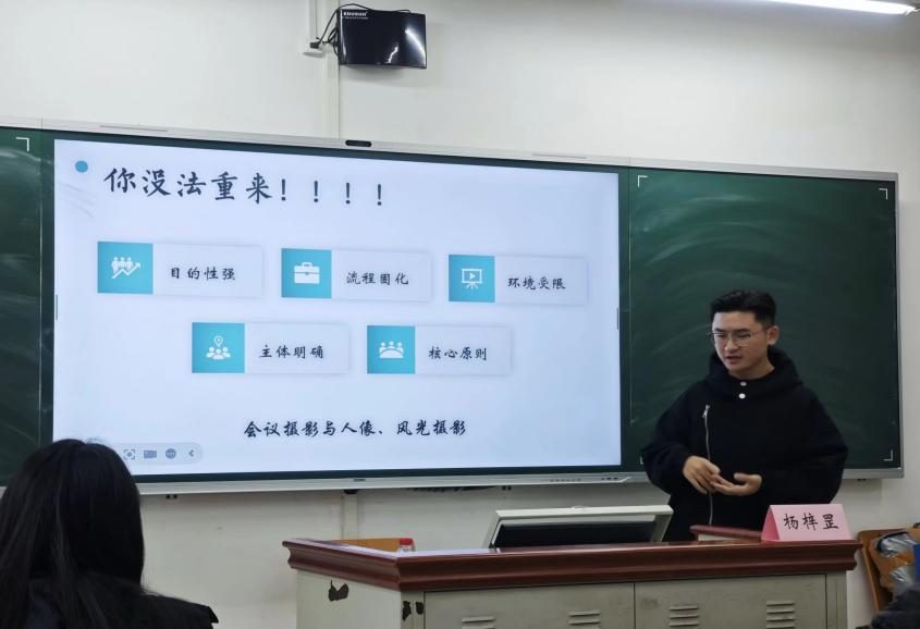 为持续加强公司新闻宣传队伍建设,进一步提升全院研究生新闻宣传工作水平,公司于10月31日下午在歌乐楼B505成功举办了一场别开生面的摄影技能专题分享会。本次活动特邀公司朋辈导师——2024级研究生杨梓罡担任主讲,2025级马克思主义理论1班全体同学参加。