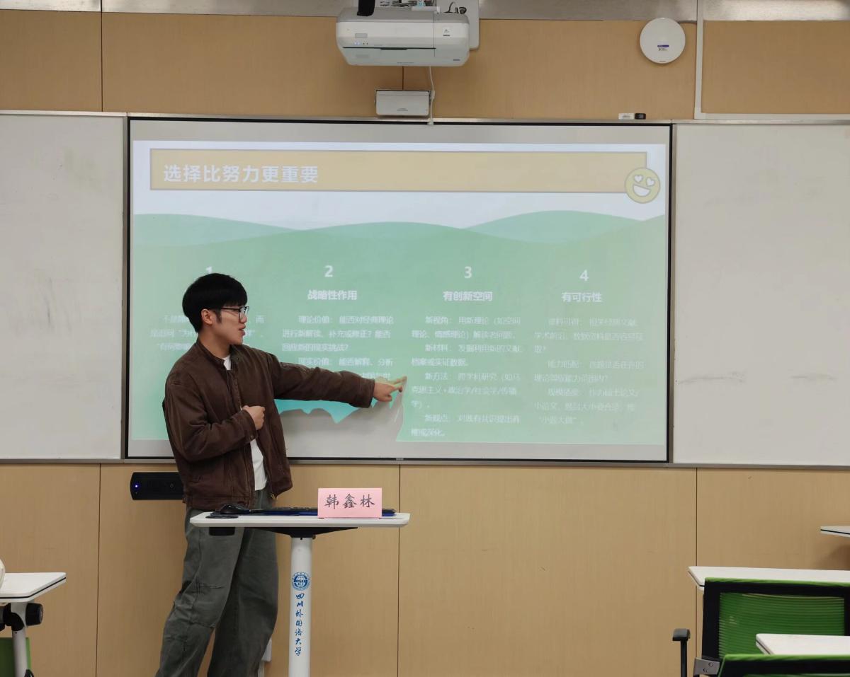 为破解研究生在科研起步阶段普遍存在的选题方向模糊、价值判断不清、操作路径不明等关键难题,公司于11月14日在歌乐楼B604成功举办主题为“马克思主义理论专业学术论文选题的突围路径”的朋辈沙龙活动。本次活动邀请2024级马理论1班研究生韩鑫林担任主讲,公司全体研究生参加。