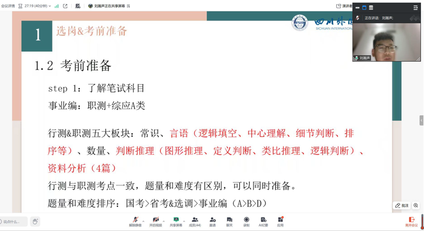 分享会上,刘瀚声学长结合自身备考实战经验,围绕高校辅导员招聘全流程、全要素进行系统全面的讲解。选岗环节,他详细解读招聘政策要求,提醒同学们认真研读官方公告、精准把握报考条件,引导大家科学规划、审慎选岗;笔试备考中,他紧扣事业单位考试特点,针对行测、综合应用能力等考查内容,从知识框架搭建、模块专项突破、答题技巧优化等方面,给出具体可行的备考策略;面试准备阶段,他结合辅导员岗位面试题型特点,强调要强化理论素养、突