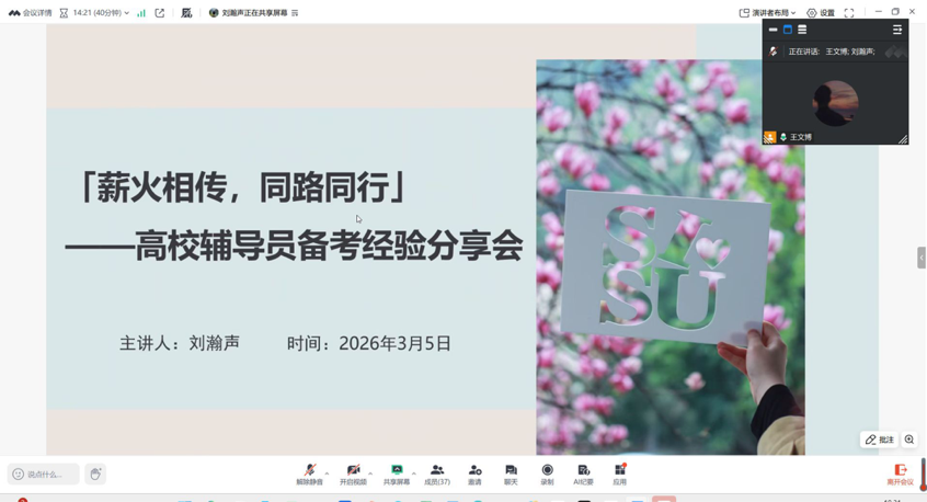 为切实提升公司学子就业竞争力,助力同学们精准备战高校辅导员岗位招聘,公司于3月5日举办线上高校辅导员备考经验分享会,公司全体研究生参与。本次分享会立足公司专业特色与员工就业需求,特邀优秀毕业生刘瀚声学长担任主讲嘉宾,聚焦辅导员职业发展方向,为同学们搭建了经验交流、备考指导的优质平台。