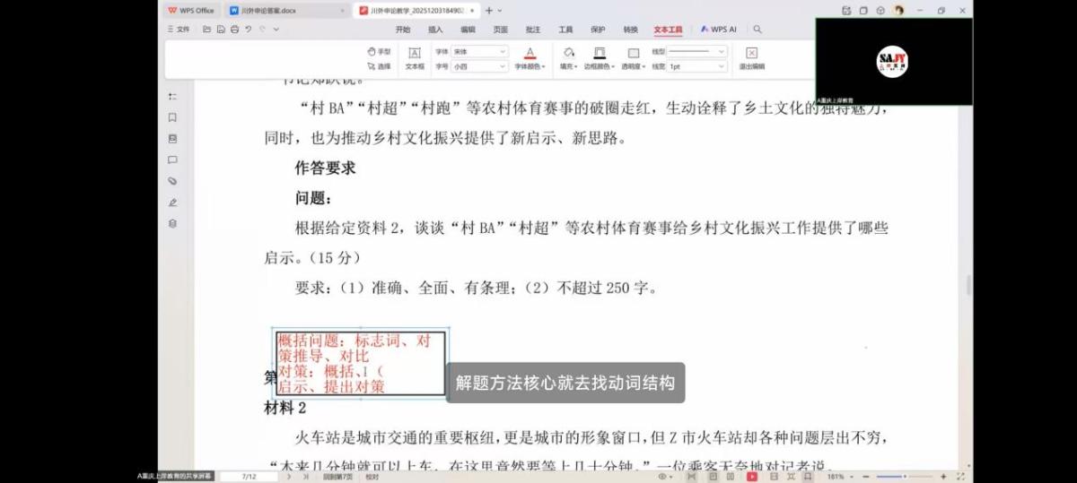 为帮助同学们系统掌握公务员考试中申论科目的重要解题方法,12月3日,公司“公职就业护航计划”第5期公开课特邀重庆某培训机构刘老师担任主讲,公司全体研究生通过线上的方式参与学习。