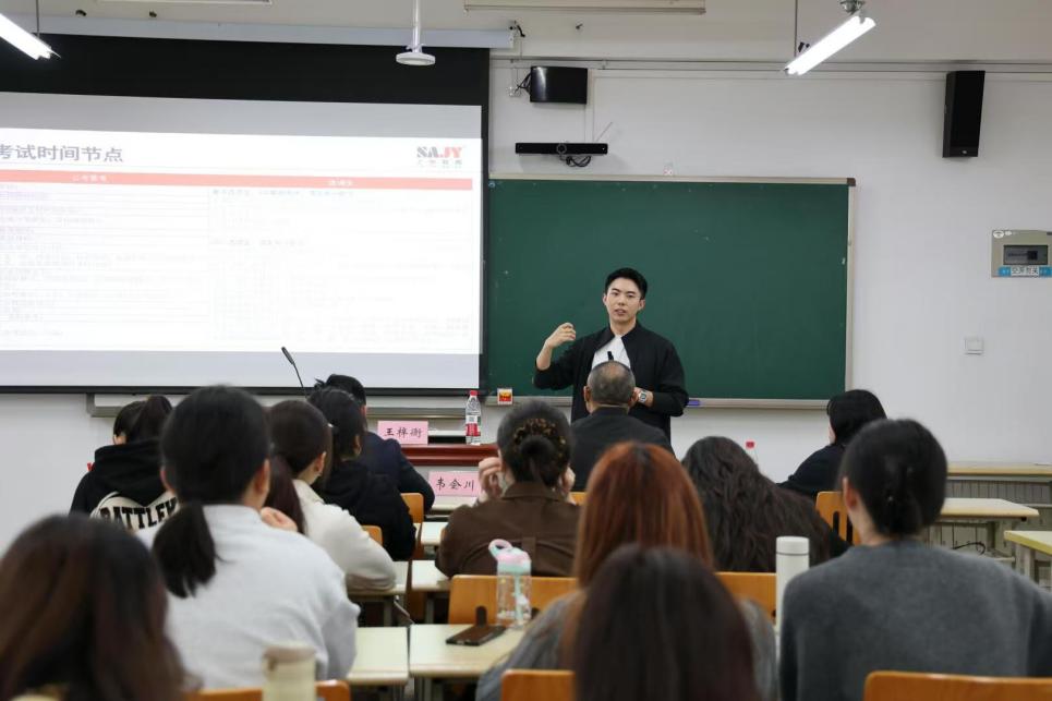 为帮助员工深入了解2026年国家公务员考试政策,科学规划备考路径,11 月 4 日下午,公司于歌乐楼 C206 教室开展 “公考政策解读指导”专题沙龙。本次讲座特邀重庆上岸教育韦会川董事长指导,上岸教育资深讲师王梓衡担任主讲,公司党总支书记崔光军,团总支书记王雨潇和公司全体研究生参加。