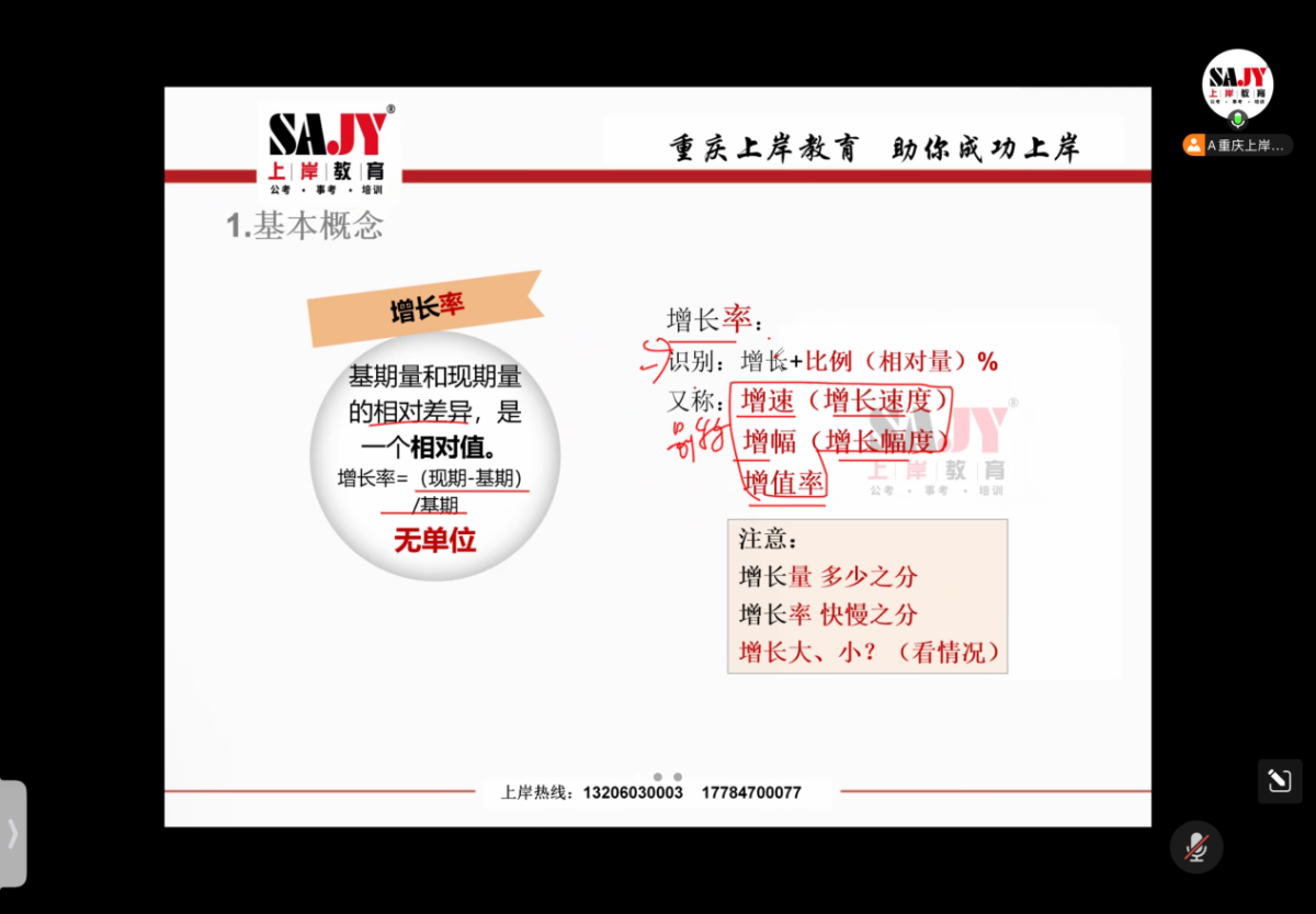 本期课程继续聚焦公务员笔试行测科目的资料分析板块展开授课。课上,孙老师围绕资料分析核心概念与速算技巧两大重点展开教学,系统讲解了现期与基期、同比与环比、增长量与增长率等核心概念,清晰梳理了各概念间的逻辑关系与区别,同时针对年均增长量、倍数与多几倍、百分数与百分点等易混知识点进行专项辨析,帮助同学们厘清概念边界。